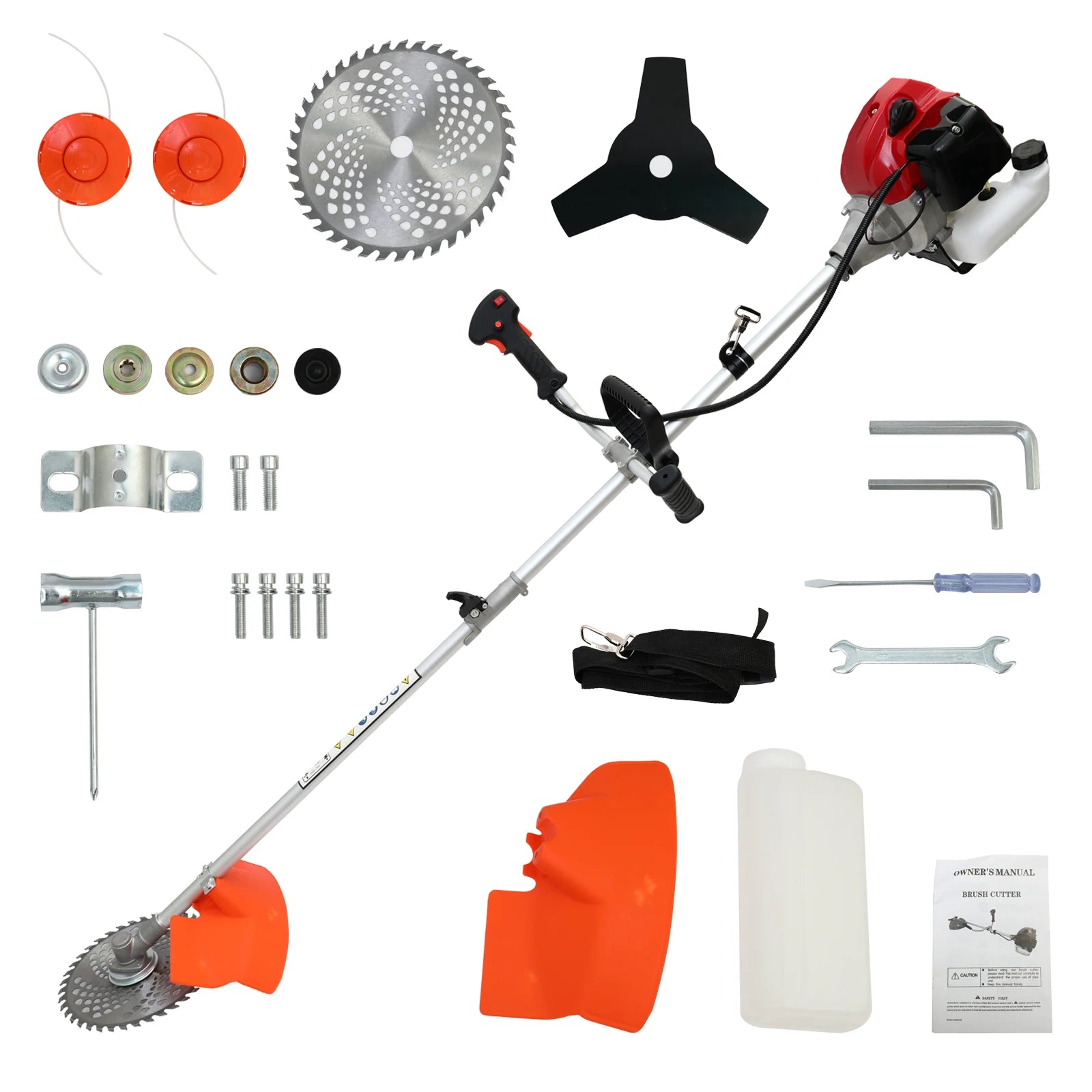 This gasoline lawn mower features an adjustable straight shaft design, making it easy to tackle various trimming needs. The ergonomic handle design ensures comfortable operation over extended periods. The 58cc two-stroke gasoline engine provides powerful performance, allowing you to quickly cut through thick grass, weeds, and shrubs. The 4-in-1 trimmer heads offer versatile functionality to meet all your garden trimming requirements. The large capacity fuel tank ensures long-lasting operation without the need for frequent refueling. The easy-to-remove baffle ensures safe operation, while the transparent fuel tank allows for easy monitoring of fuel levels. This gasoline weed eater is powerful and stable, freeing you from concerns about battery aging and power cord length, making your garden trimming tasks more efficient and convenient. Choose it to bring a fresh new look to your garden!